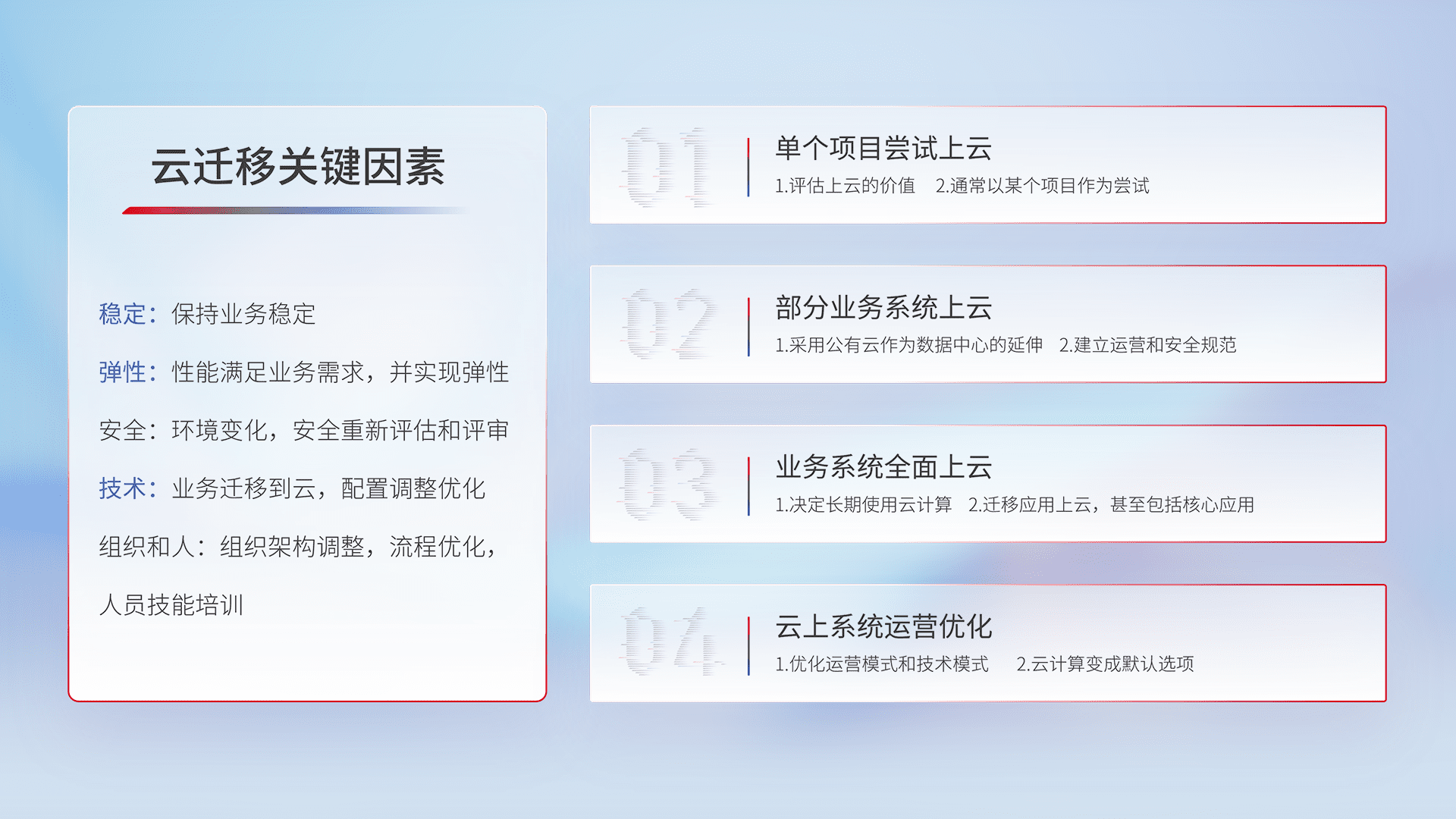 结合实际业务,,,,从规划设计、、、、云平台选型、、、云原生改造、、、数据迁移、、、集成交付,,,迁移全过程为客户识别最佳上云路径,,做好风险识别管理,,,设计网络架构、、身份权限、、、安全审计合规、、操作审计、、、、日志审计、、监控告警策略、、多站点容灾设计等,,对云上基础设施进行整体规划,,,,提升IT治理水平,,,,以满足弹性、、高可用、、高性能的需求。。。。