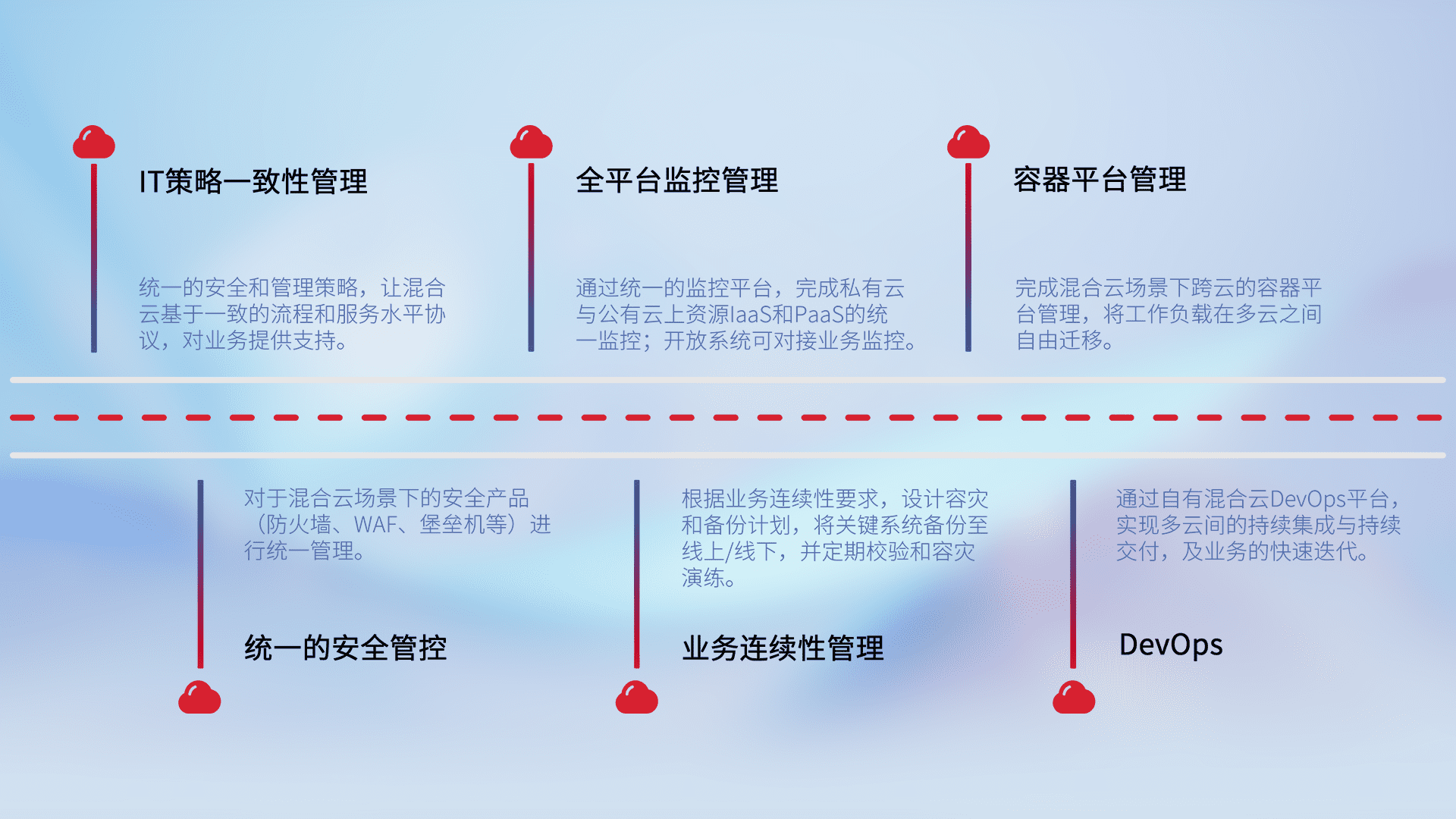 通过多云纳管,,,以统一的资源数据模型把客户的云资源进行抽象和封装,,,进而实现对多云资源的统一操作,,保障云资源管理的可靠性、、稳定性与可用性。。量身定制化运维内容,,配置、、、、开发运维、、、、补丁管理、、备份、、、监控、、认证和访问管理、、、审计和日常巡检等,,,保障在用云过程中的可靠度,,,,稳定度以及高可用率。。