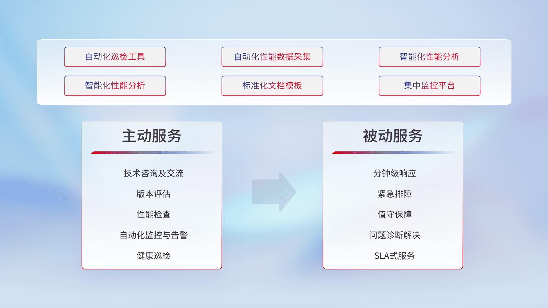 智能化工具和标准化文档,,,保障服务质量,,,提供主动服务(包含技术咨询、、、版本评估、、性能检查、、、、自动化监控与告警、、、健康巡检)和被动服务包含(分钟级响应、、、、紧急排障、、、值守保障、、、问题诊断解决、、、SLA服务)。。。